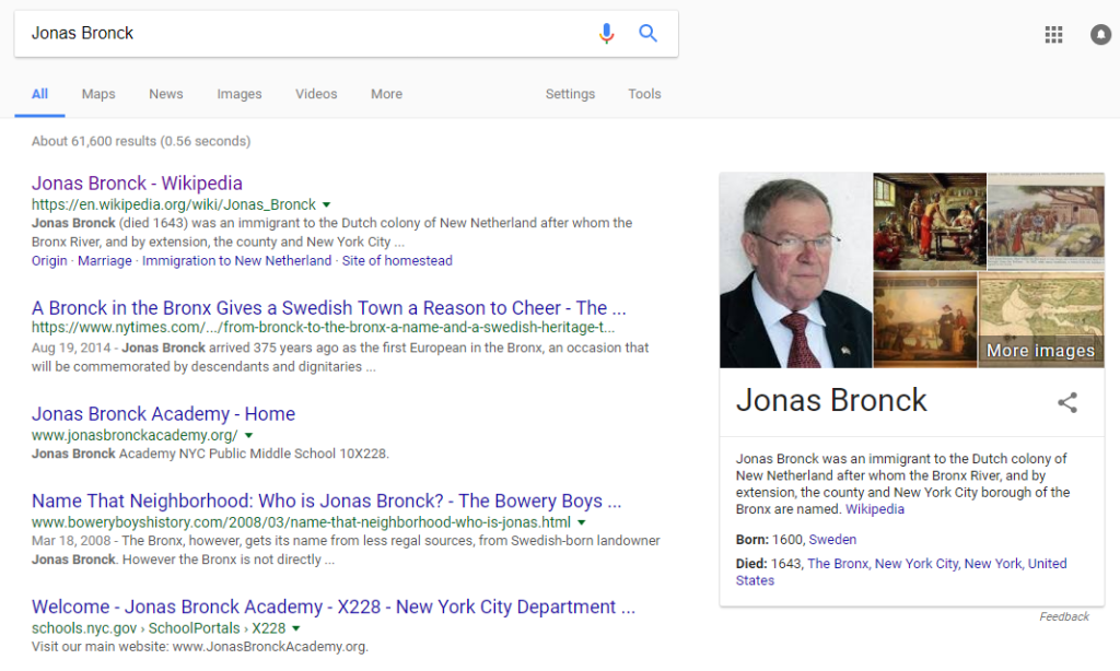 Google hodil popis z vikipédie, ale dal fotku Curta Wrigforsa, predsedu Centra Jonasa Broncka (podľa ktorého je, mimochodom, pomenovaný newyorský Bronx) vo švédskej usadlosti Sävsjö, neďaleko Bronckovho rodiska. Skrínšot je z roku 2017, 2-3 roky po publikovaní článku, z ktorého je tá fotka (teraz je to už opravené).