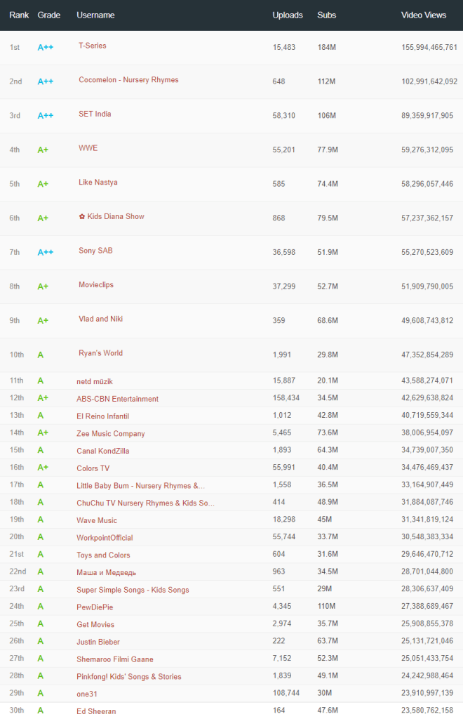Na prvom mieste (so 154 miliardami agregátnych zhliadnutí) je indický kanál T-Series, špecializujúci sa na hudbu (pesničky) – indické, nie anglické.